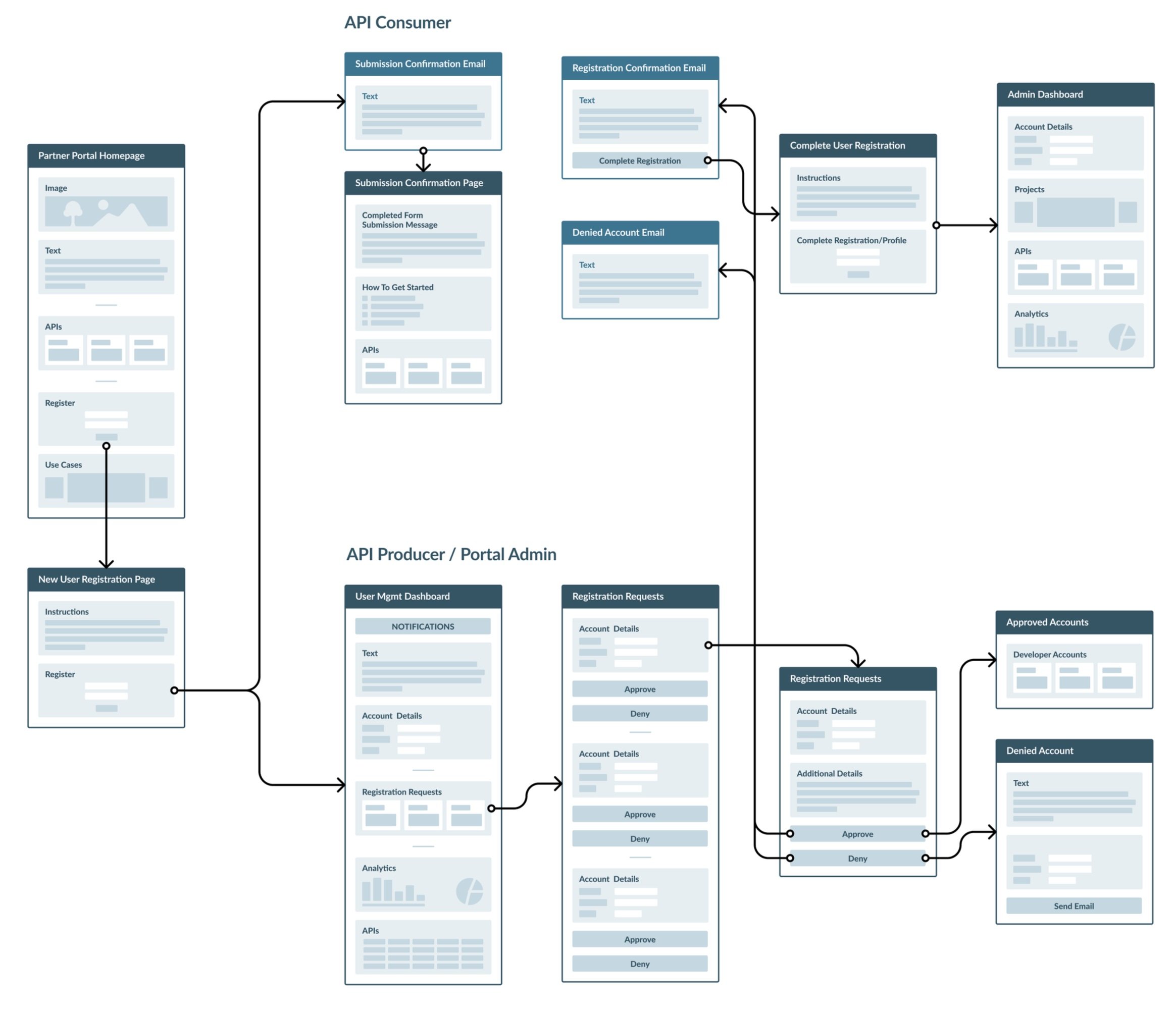 To guide design decisions, I created both user journey maps and user flow diagrams. Journey maps helped me visualize the end-to-end experience across different personas, highlighting pain points, key interactions, and opportunities for improvement. User flows allowed me to zoom in on specific tasks—such as API discovery or credentialing—to ensure efficient, intuitive pathways through the portal.